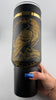 Engraved in House, 40oz Black Tumbler with Gold Engraving, removable handle, comes with straw and care instructions.
