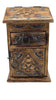 Hand-carved, dark stained Mango Wood 4x9". Features top and front drawers. Carved Triquetra on top & sides and Black Iron Fittings